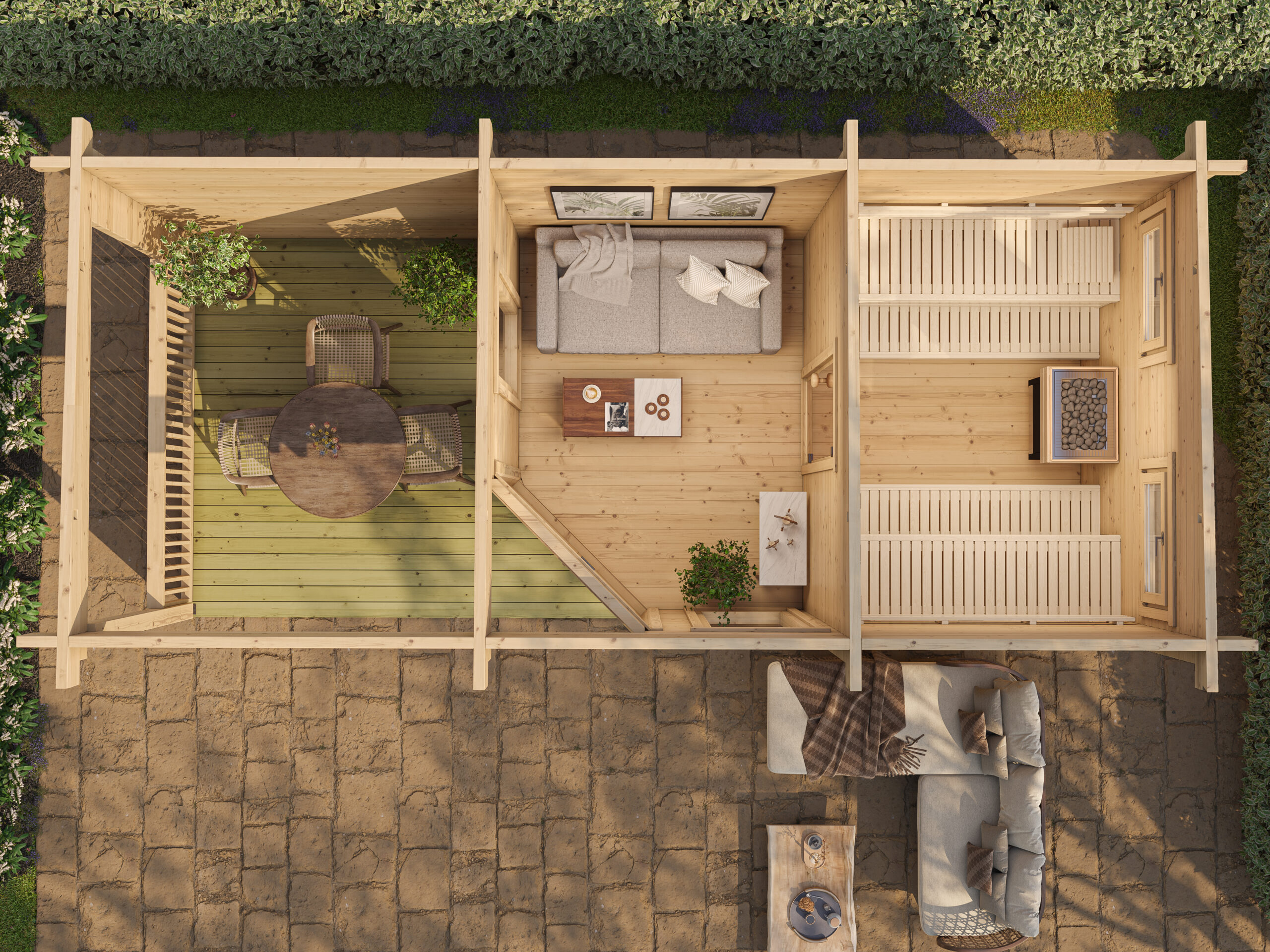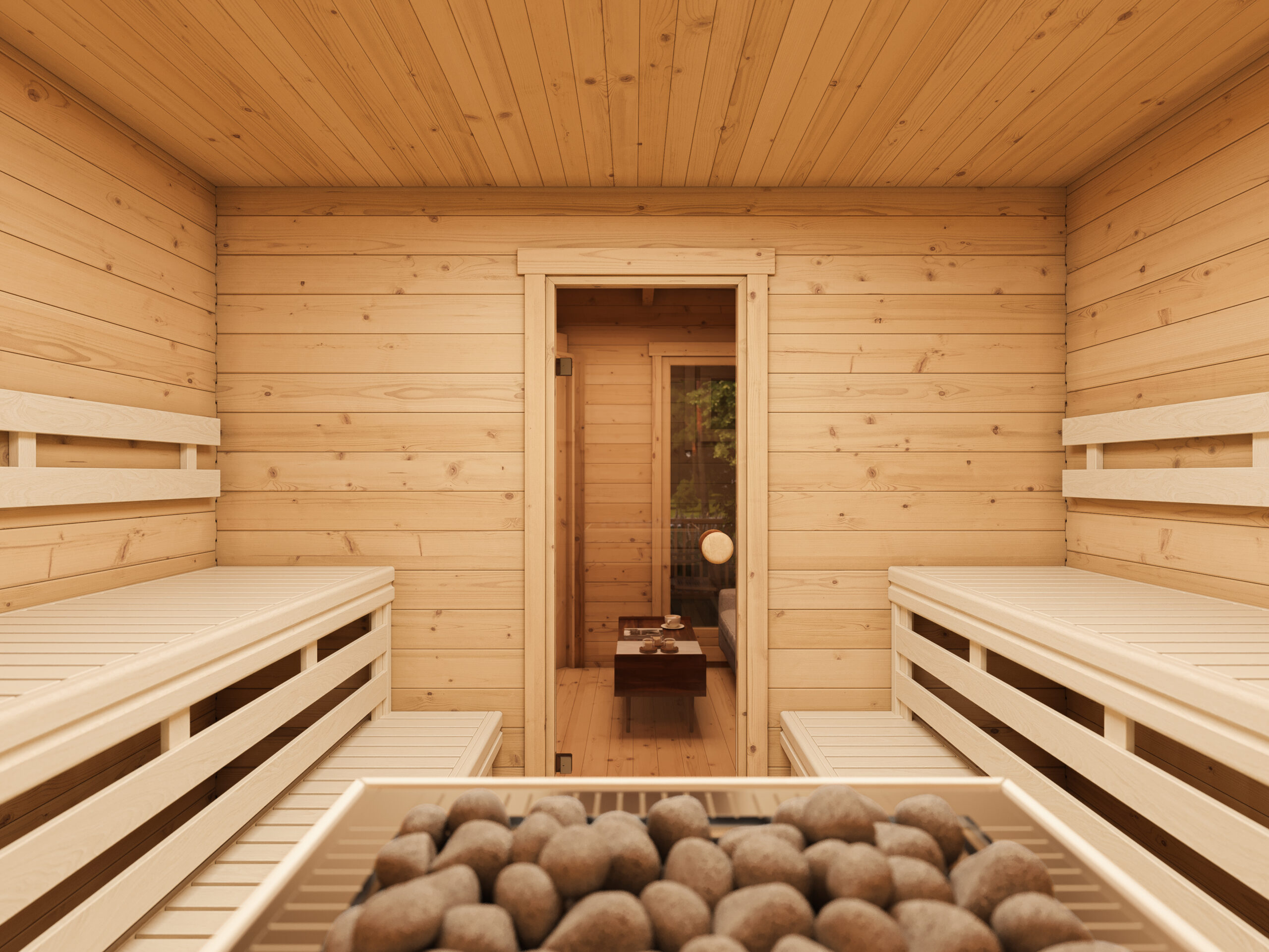 - 2x 900 mm wide opening windows with tempered double glazing in the sauna room